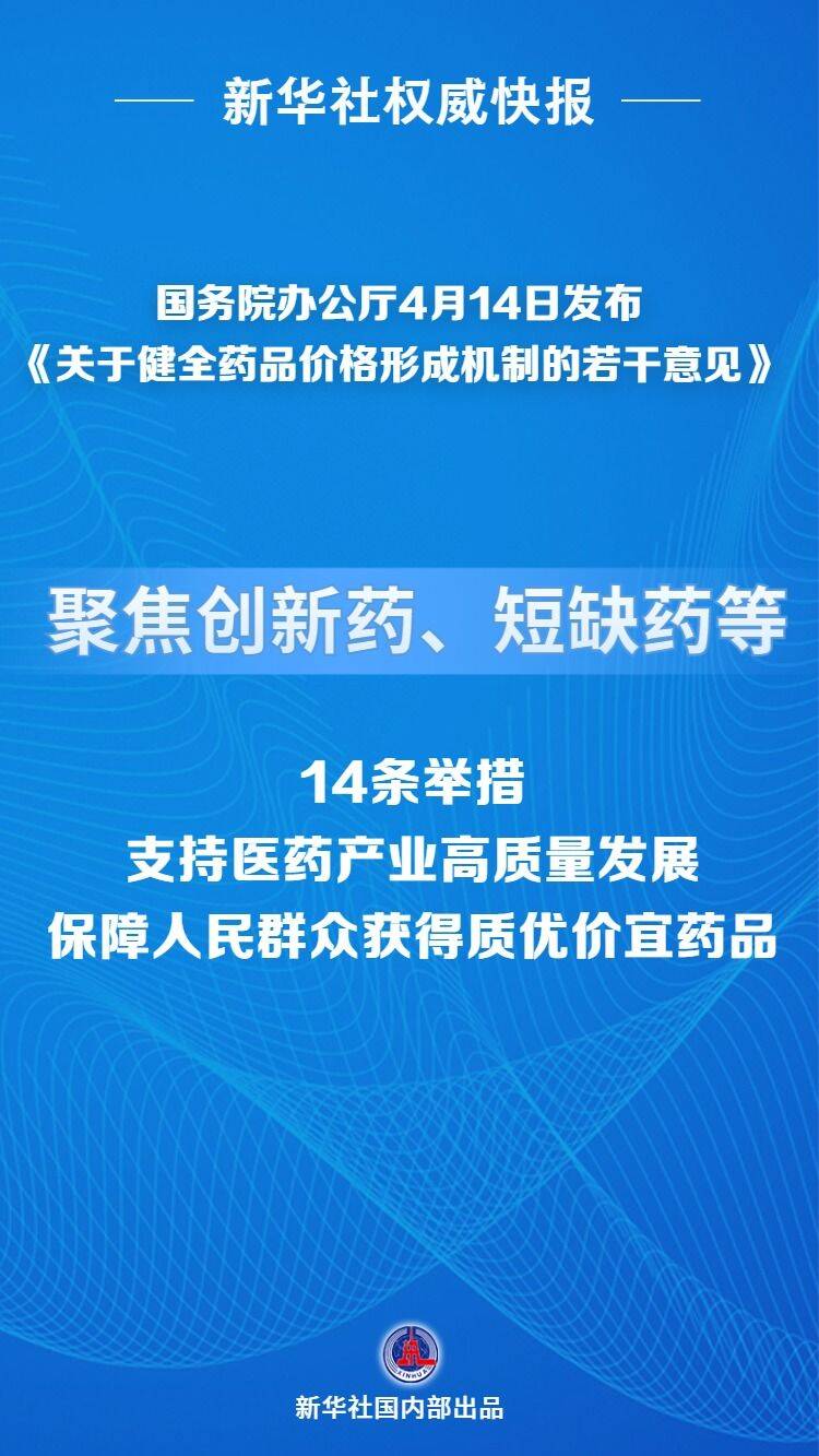 國(guó)務(wù)院辦公廳4月14日發(fā)布《關(guān)于健全藥品價(jià)格形成機(jī)制的若干意見(jiàn)》,提出14條舉措,包括優(yōu)化創(chuàng)新藥等新上市藥品首發(fā)價(jià)格機(jī)制、發(fā)揮醫(yī)保支付標(biāo)準(zhǔn)對(duì)藥品價(jià)格形成的引導(dǎo)作用、引導(dǎo)藥店合理制定藥品零售價(jià)格、強(qiáng)化短缺藥保供穩(wěn)價(jià)等。